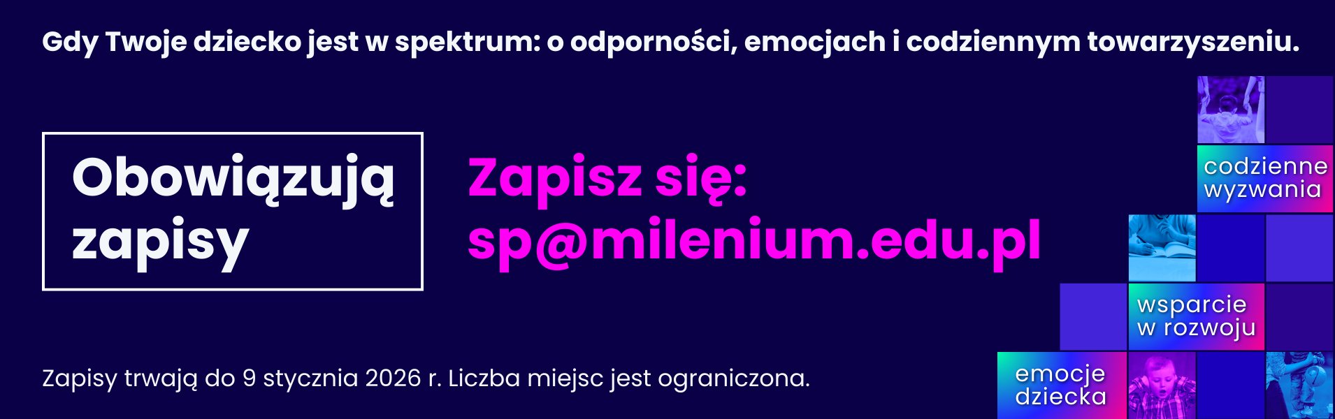 Celem spotkania jest przekazanie rzetelnej wiedzy, stworzenie przestrzeni do refleksji oraz umożliwienie bezpośredniego kontaktu z doświadczonymi specjalistami i nauczycielami pracującymi na co dzień z dziećmi z SPE. Uczestnicy dowiedzą się, jak skutecznie wspierać rozwój dziecka, radzić sobie z wyzwaniami emocjonalnymi oraz budować odporność psychiczną zarówno u dzieci, jak i w całej rodzinie.