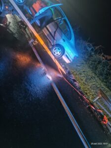 Kierującemu pojazdem nic się nie stało – opuścił go o własnych siłach. Na miejsce wezwano OSP Strzyżewo Smykowe, które zabezpieczyło rejon zdarzenia. Aby wyciągnąć pojazd na lawetę, konieczne było rozmontowanie barier energochłonnych – do czasu usunięcia auta ruch na drodze odbywał się z niewielkimi utrudnieniami. Okoliczności zdarzenia ustala policja.