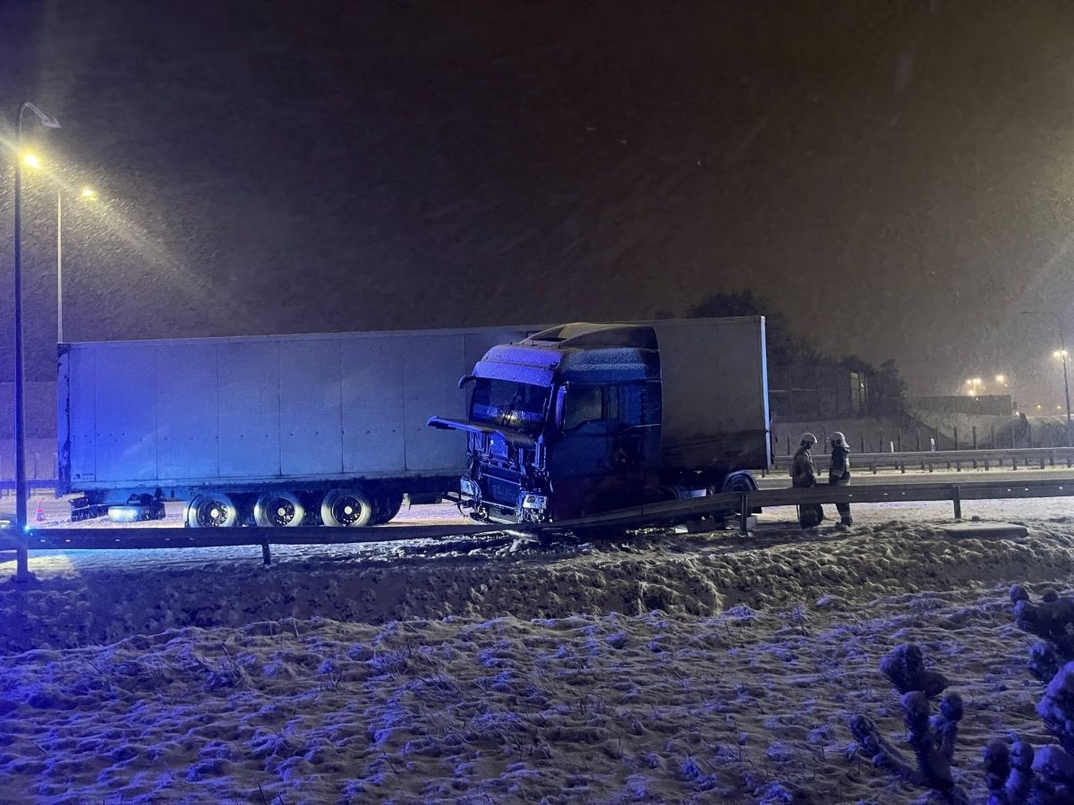W nocy z wtorku na środę, kiedy nad regionem przechodziły opady śniegu, na drodze ekspresowej doszło do kolizji z udziałem samochodu ciężarowego – na skutek zdarzenia doszło do wycieku paliwa.